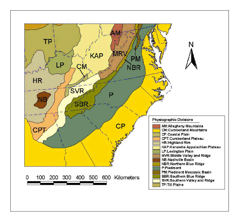 Map of the physiographic provinces comprising the Southern Appalachian Highland and surrounding areas.