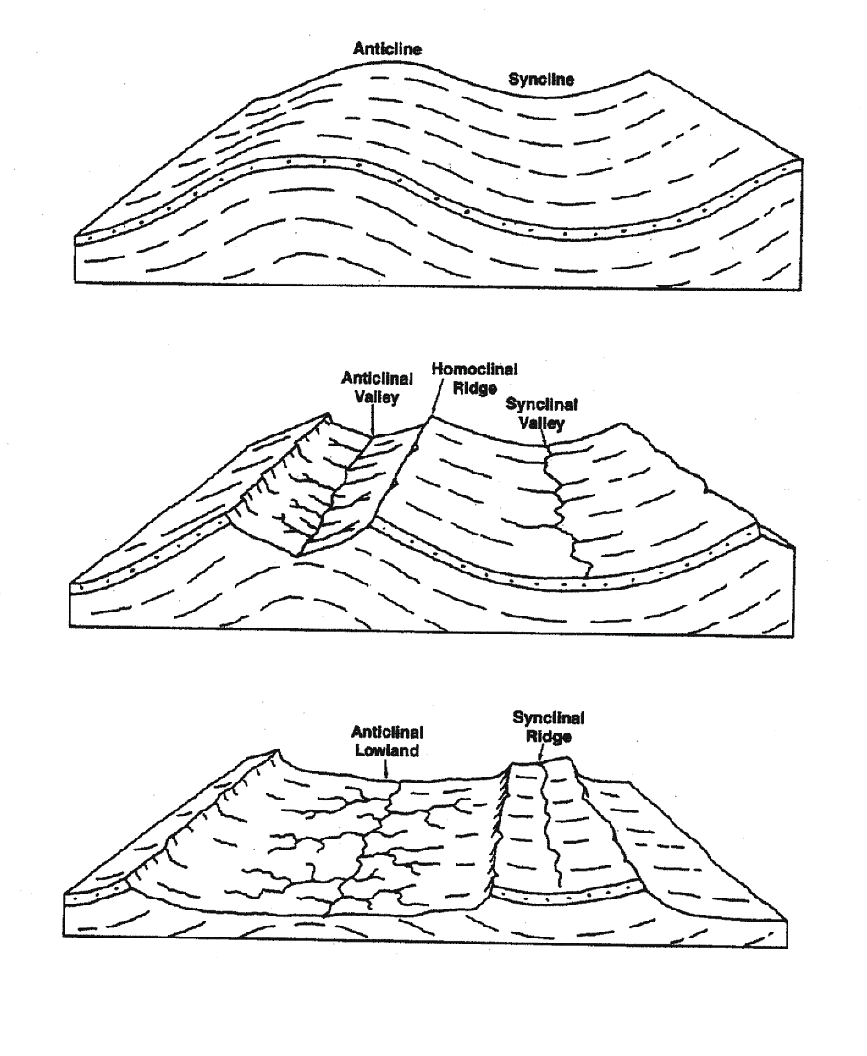 Drainage evolution in folded strata of Ridge and Valley province, showing effect of structure on topography.