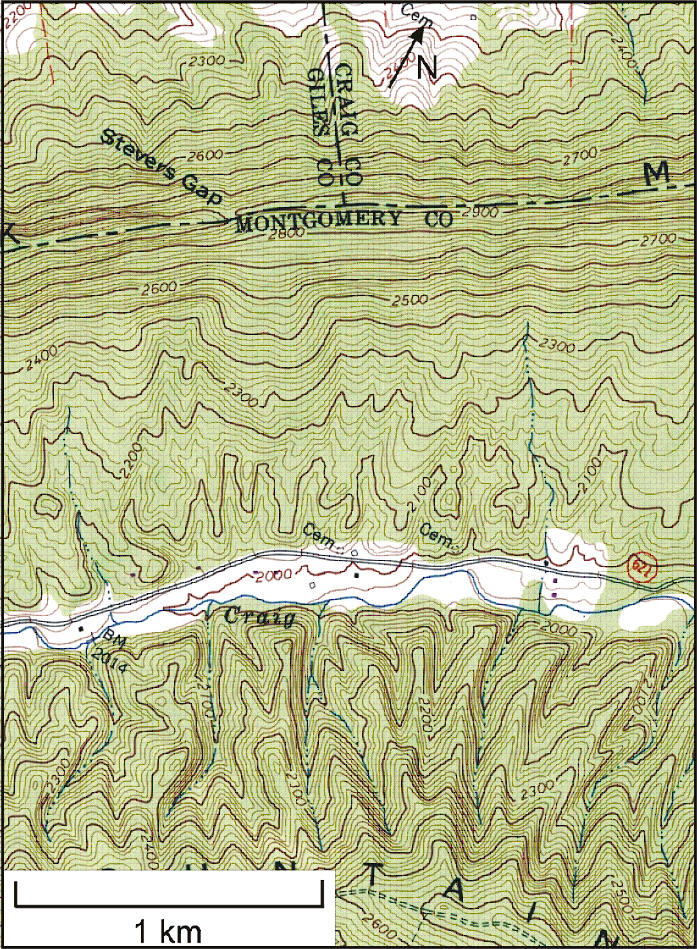 Topographic map showing typical hollows in Ridge and Valley province of southwestern Virginia