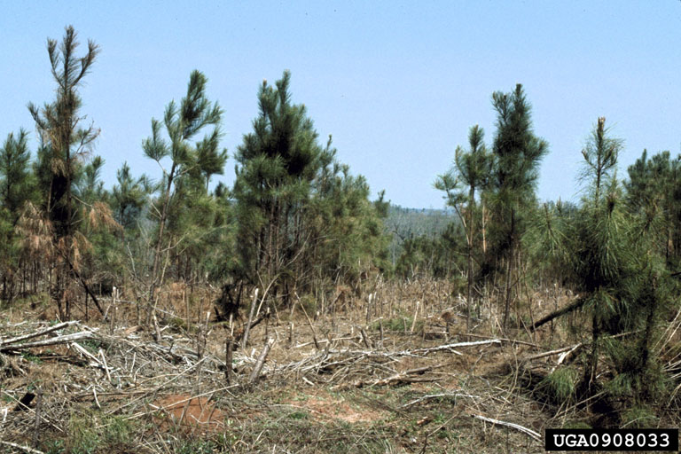 Overstocked planted stand (from natural pine seeding) after thinning using a drum chopper