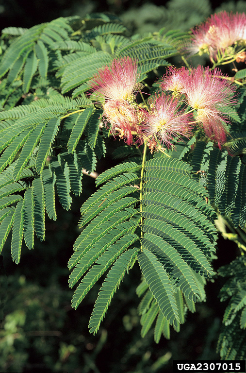 Mimosa flowers are very showy and fragrant. The leaves are delicate-looking and bipinnately compound.
