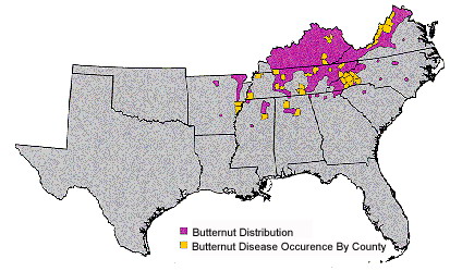 Butternut distribution and butternut canker distribution by county.