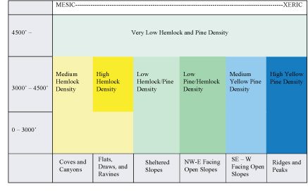 Figure 1 depicts the distribution of hemlock and pine density in the southern Appalachian Mountains. The highest density of hemlocks are found in flats, draws, and ravines at an elevation of 3000'-4500' whereas the highest densities of yellow pines are found on ridges and peaks between elevations of 0 and 3000'.