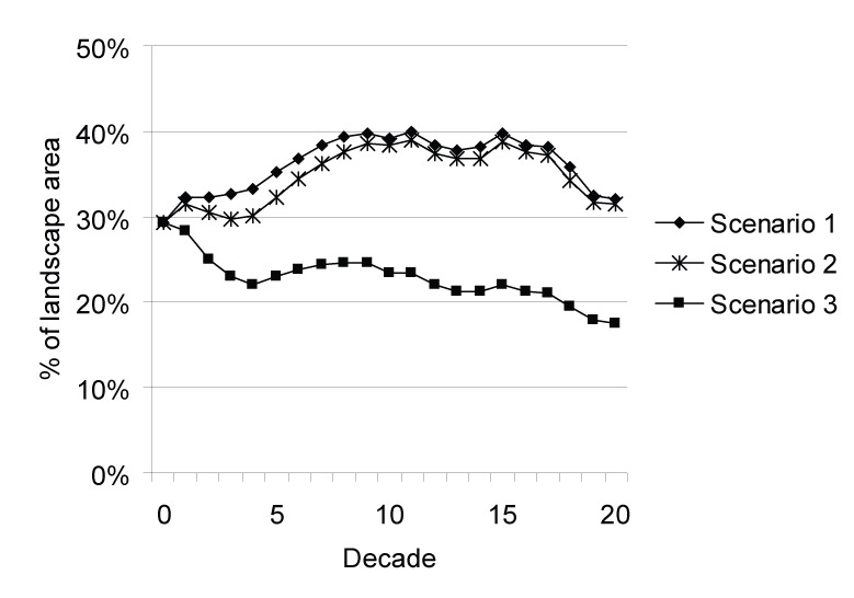 Proportion of the study area in multi-story large and very large tree structure classes by scenario in the Five Buttes Study area, central Oregon, USA.